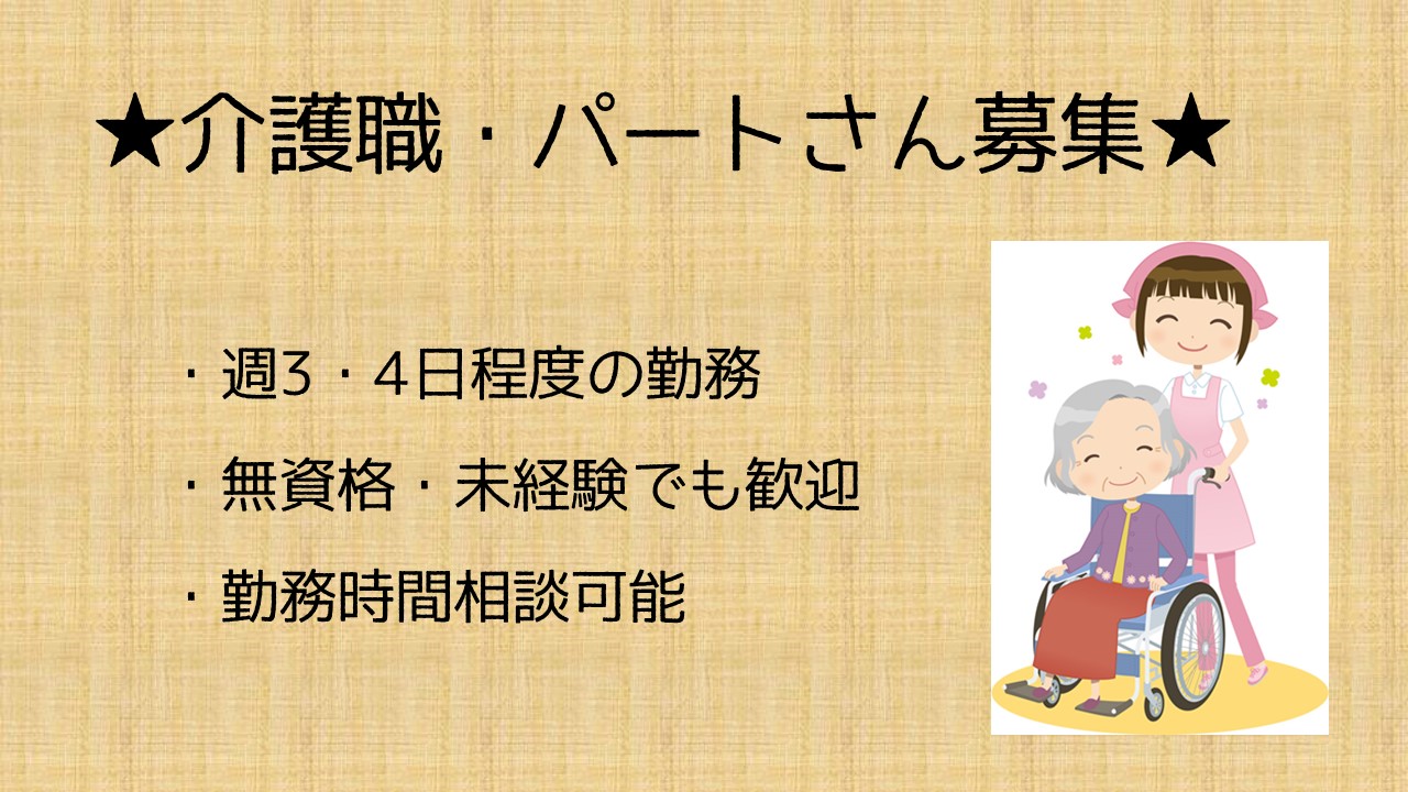 ※食事、排泄、入浴介助、送迎(軽自動車)、訪問、レクレーション等が主な業務です。
