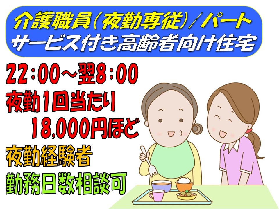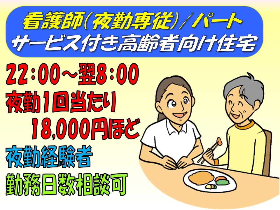 サービス付き高齢者向け住宅(施設内利用者人数20名)の夜勤業務を行っていただきます。