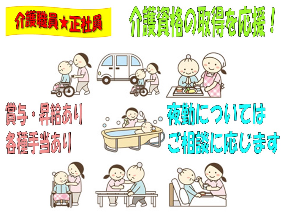 食事・入浴・排泄介助・レクレーション・ケアプラン作成に関わって頂きます。